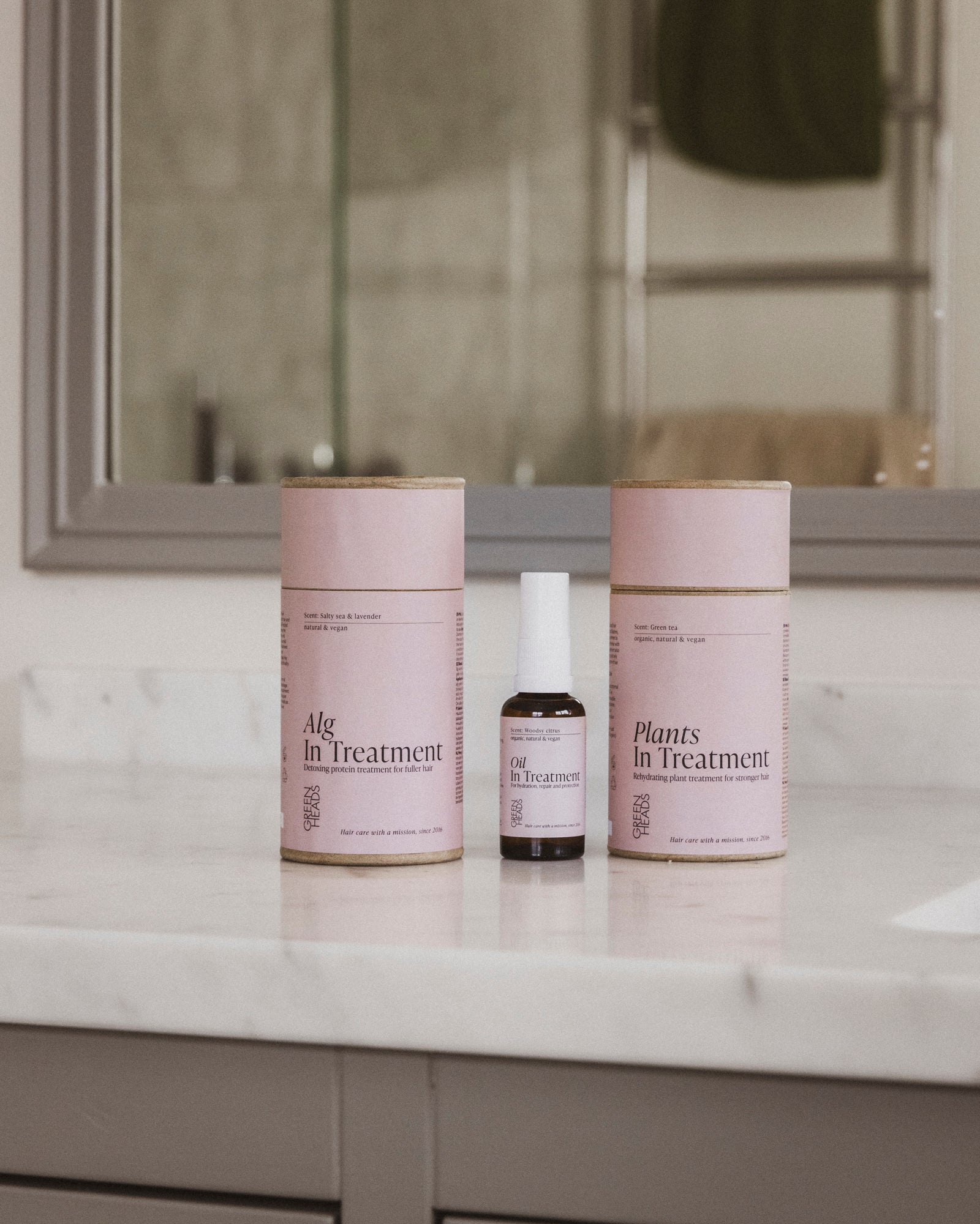 Green Heads - Alg In Treatment är en 100% naturlig hårvårdskur med alger som detoxar och stärker både hår och hårbotten samt lavendel som verkar lugnande för hårbotten. Kuren innehåller naturliga aminosyror vilka bidrar till att bygga upp håret och ge en känslan av ett fylligare hår. Den rengör hår och hårbotten från beläggningar samt metaller som kan missfärga håret. Alg In Treatment har en naturlig doft av salta hav och lavendel.