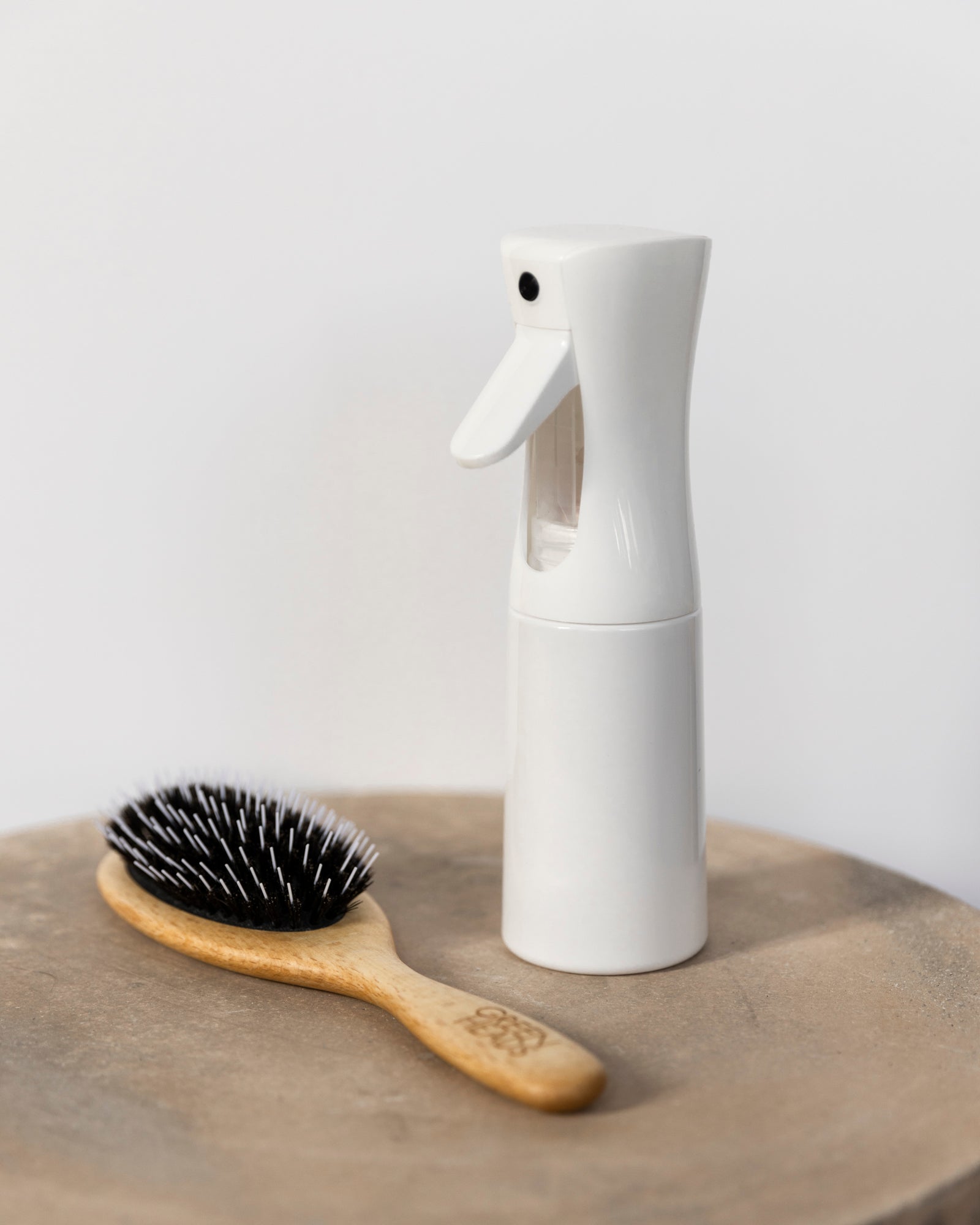 Fyll sprayflaskan med färskt vatten och spraya jämnt på torrt hår för att återuppliva lockar, bevara fukt och kamma över benor och virvlar som smugit fram tex på natten.